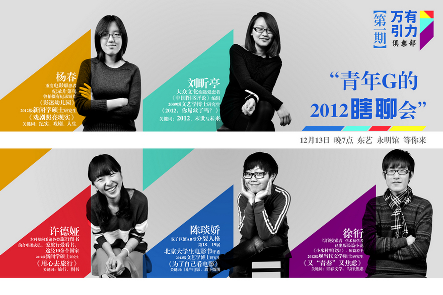 原本枯燥的学术交流被改造成了“青年G的2012瞎聊会”——5名青年各自分享了2012年在电影、大众文化、纪录片、青年文学、旅行等领域的观察和感悟。在3个小时开放式的讨论中,没有人是真正的中心。这种所有人对所有人分享的交流平台将“瞎聊也能有启发”变为现实。