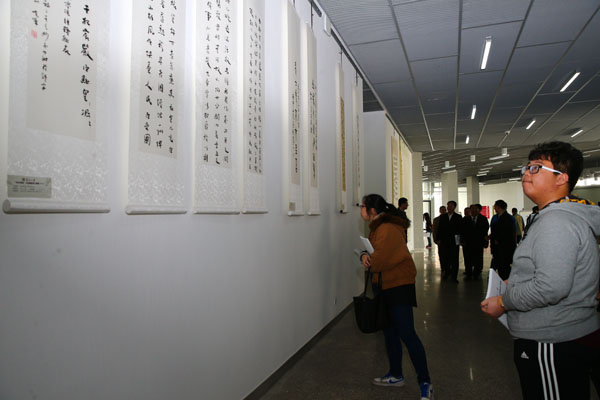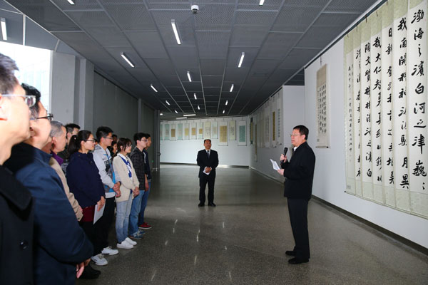 开幕式结束后,师生代表一同参观了作品展。此次展览共展出包括楷书、草书、隶书、篆书、行书等不同书写形式的书法作品近百幅。