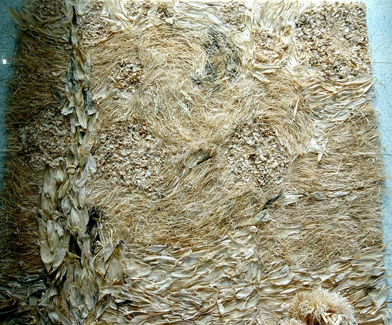 本次展览上,设觉传达设计专业李晶的作品《玉米皮形态设计研究》,独特的创作素材,让人眼前一亮。条状、块状、平铺,各种形态的玉米皮组合在一起,有些部分由于存贮环境和湿度的原因,呈现出自然肌理(黑色发霉)状态,与整体画面异常和谐。