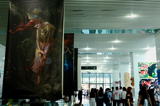 因为对文学的热爱,数字绘画专业的顾梦迪将自己的毕业作品聚焦到文学性较强的“七宗罪”上,用新的绘画技法加上后现代的文化符号化加以创作,七副作品悬挂大厅,给人造成强烈的视觉效果。“这个作品就是考验我们的画画功底,一笔一笔磨出来的。我从去年11月份开始调研,前前后后用了四个多月的时间完成,比较辛苦,但是挺有成就感的。”顾梦迪笑着说道。
