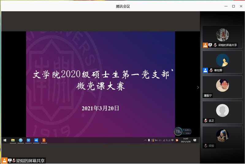 (通讯员 崔在晖)为学习贯彻习近平总书记关于党史学习教育的重要讲话精神,提升党课宣讲的思想性和针对性,增强党课的吸引力和感染力,不断丰富党员教育内容体系,3月20日下午,太阳集团tcy87222020级硕士生第一党支部开展线上微党课大赛。公司四位研究生党支部书记担任评委,支部入党积极分子和申请人参会观摩。
