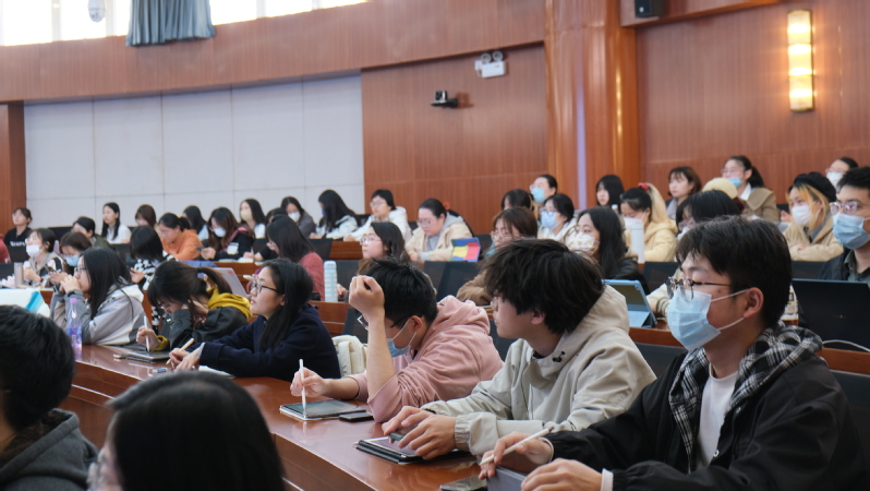 石锋教授以经典语言学问题“语言从哪里来”开篇,为同学们介绍语言起源的“猿啼说”,并以“用嘴投票的创举”这一比喻清晰地说明了“语言是怎样约定俗成的”。石锋教授将赵元任的连续统思想、王士元的词汇扩散论、拉波夫的概率匹配说、乔姆斯基的生成语法理论穿插在知识的讲述当中,把语言学的经典理论与前沿领域相结合,为同学们介绍了人与人工智能在语言学习上的异同——人工智能无法完全取代人类,其不能做“无中生有”之工作。