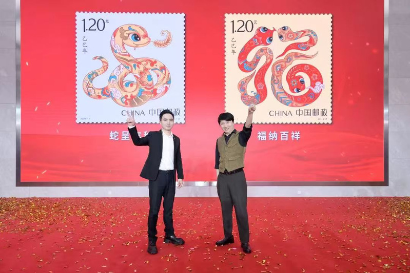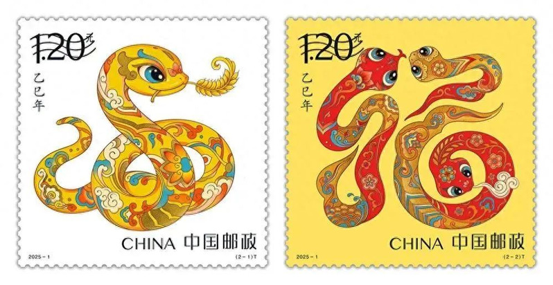 该套邮票第一枚图名为“蛇呈丰稔”(左),画面提炼了中华传统文化中盘蛇的灵动意象,加以喜庆装饰应和年节氛围。第二枚图名为“福纳百祥”(右),画面以草书笔意将三条蛇创意性地构成了“福”的字形,简练洒脱、柔美顺通。