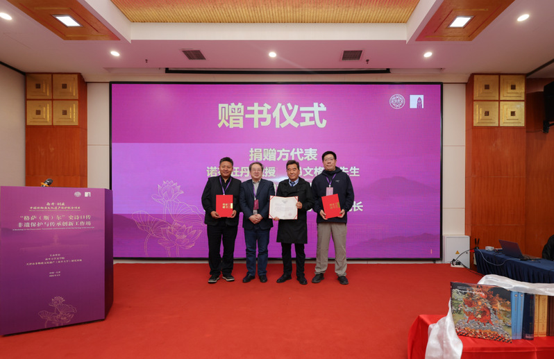 开幕式上,还举行了图书捐赠仪式。全国《格萨(斯)尔》工作领导小组办公室,玉树州文体旅游广电局,玉树州《格萨尔》研究学会向太阳集团tcy8722捐赠《格萨尔》史诗汉译本30卷(31册)、《格萨尔藏汉对照规范大辞典》(1册)、《格萨尔英雄史诗音乐大典》(上下2册)、《格萨尔史诗谚语警句选录》(上下2册)、《格萨尔英雄人物图像荟萃》(1册),共计图书5种37册。这些书籍凝聚着众多学者和研究人员的心血,是《格萨(斯)尔》史诗研究与传承工作里程碑式的重要成果,对于《格萨(斯)尔》史诗文化保护与研究的深入开展具有极高价值。