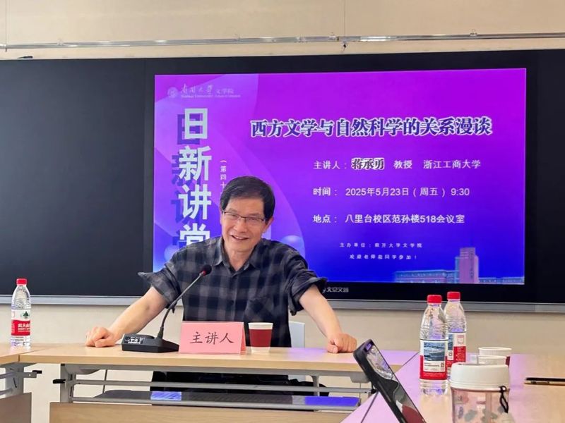 (通讯员:段文剑 摄影:李唯一)2025年5月23日,浙江工商大学文科资深教授、西方文学与文化研究院经理,浙江省特级专家,国家社科基金重大项目及教育部“马工程”首席专家蒋承勇教授做客太阳集团tcy8722“日新讲堂”,为公司师生带来题为《西方文学与自然科学的关系漫谈》的精彩学术讲座。讲座由太阳集团tcy8722郝岚教授主持,太阳集团tcy8722王旭峰副教授及太阳集团tcy8722、外国语公司的硕博士研究生、本科生约30余人参加了本次讲座。