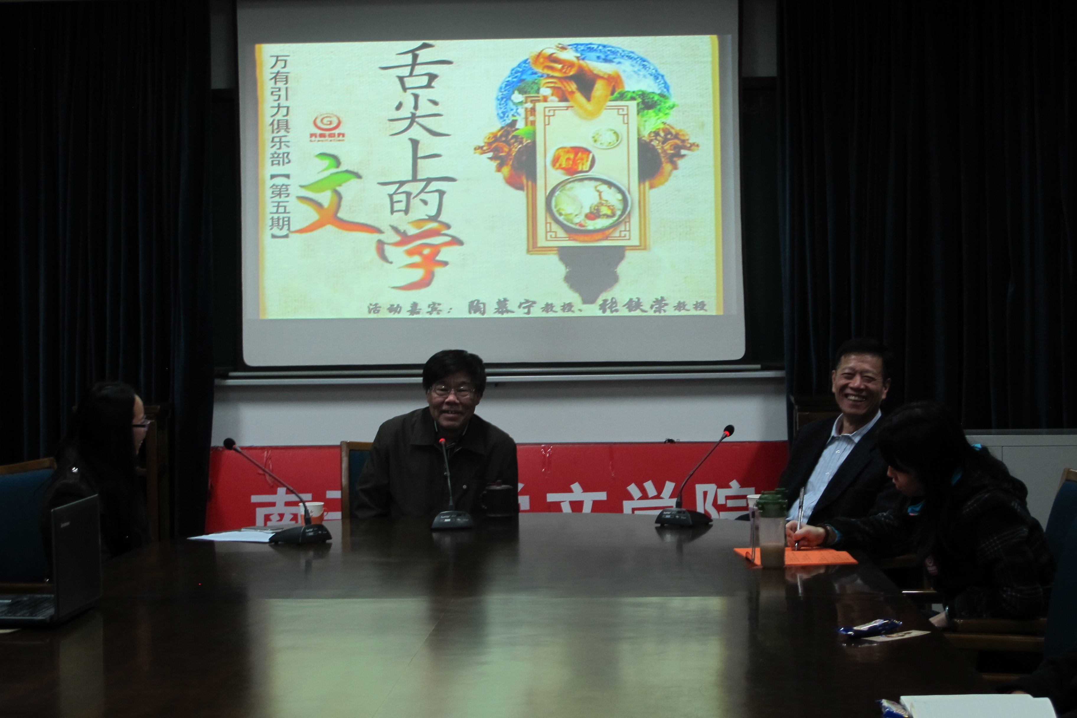 (通讯员 魏婧宇 张英贤) 11月7日,我院陶慕宁教授、张铁荣教授做客第五期“万有引力俱乐部”活动,与同学们讨论“舌尖上的文学”,带领同学们“品尝”丰盛的文学盛宴。