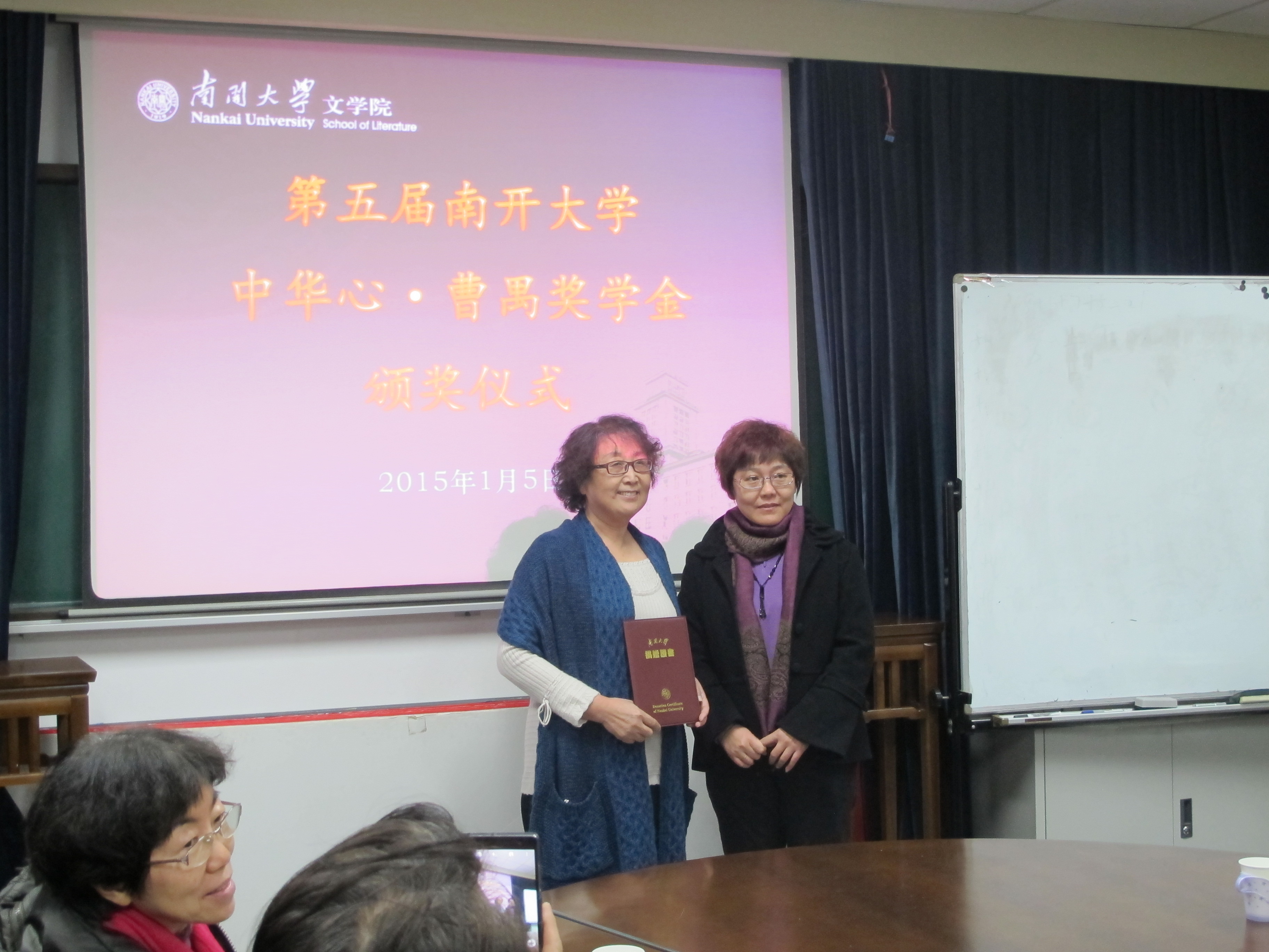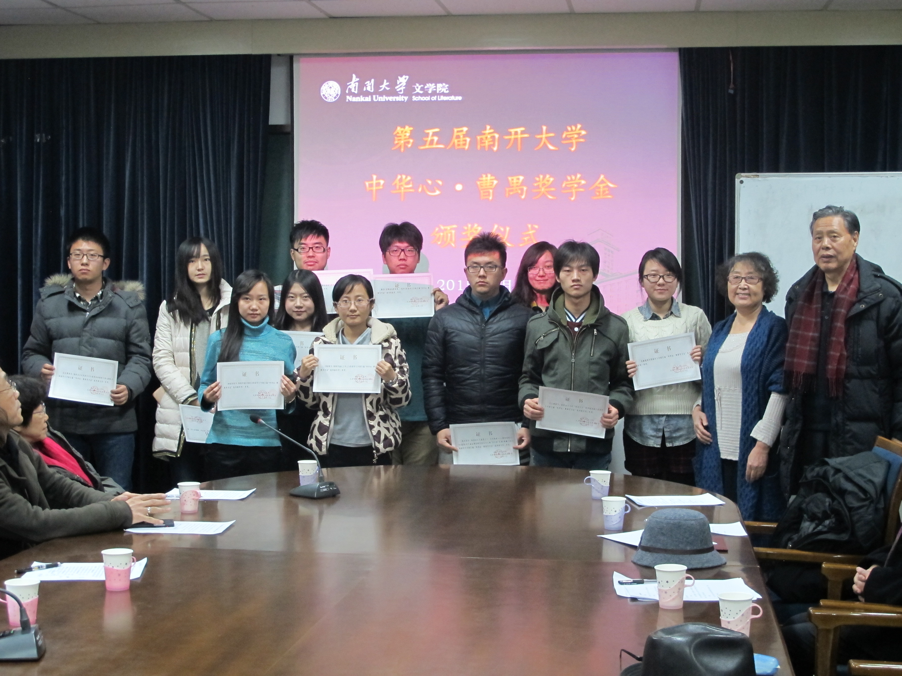中文系主任乔以钢介绍了“中华心·曹禺奖学金”及此次评审情况,并宣布获奖名单。本年度“中华心•曹禺奖学金”申报评审工作于2014年11月初启动,向全校22个专业公司以及活跃在南开园内的员工剧社发布了评选通知。经过初评、复评和终评三轮评审,确定了获奖名单。