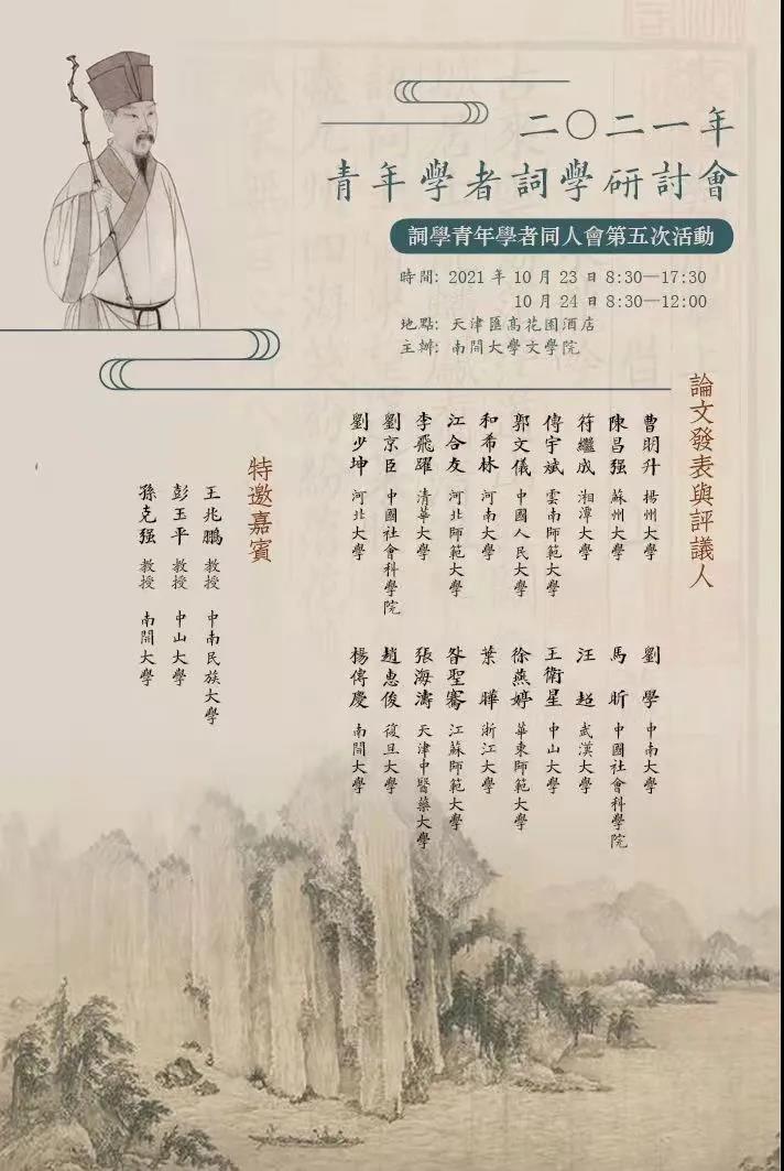 10月24日 周日 8:30—9:40 第五场 主持人:汪超(武汉大学) (发言人10分钟,每位评议人5分钟) 1. 天宝十三载改诸乐名考论 发言人:李飞跃(清华大学) 评议人:江合友 杨传庆 2. 词籍校勘之“律校法”探赜 发言人:刘少坤(河北大学) 评议人:曹明升 和希林 3. 唐圭璋《梦桐室词话》考述 发言人:和希林(河南大学) 评议人:江合友 杨传庆 自由讨论:10分钟 9:50—11:20 第六场 主持人:江合友(河北师范大学) (发言人10分钟,每位评议人5分钟) 1. 贯通作为写法:苏轼《水龙吟》词的词调史考察 发言人:叶晔 (浙江大学) 评议人:汪超 王卫星 2. 论诗学话语的词学转化——以词味说为例 发言人:符继成(湘潭大学) 评议人:汪超 赵惠俊 3. 词学史上的东坡绮语词批评 发言人:杨传庆(太阳集团tcy8722) 评议人:符继成 曹明升 自由讨论:10分钟 上午场总评:20分钟 特邀嘉宾:王兆鹏 教授(中南民族大学)