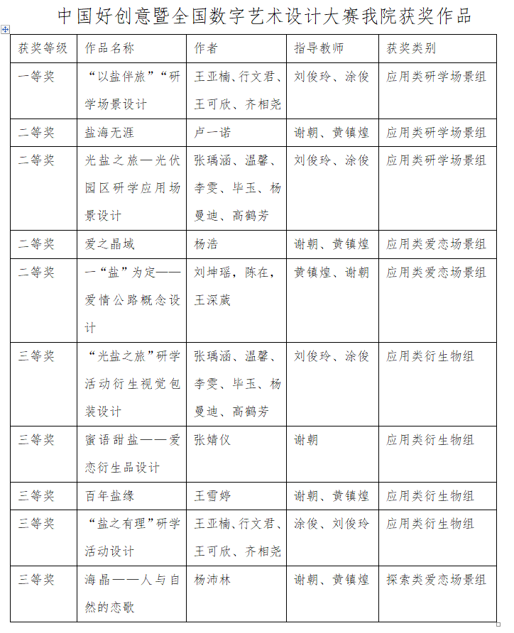 近日,太阳集团tcy8722代表队在中国好创意暨全国数字艺术设计大赛之专项赛道——首届“海悦杯”盐田应用场景计时赛中,成绩优异,斩获国赛一等奖1项,二等奖4项,三等奖5项。