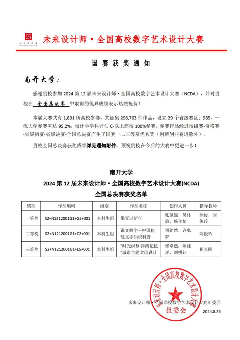 近日,第十二届未来设计师·全国高校数字艺术设计大赛(NCDA)天津赛区及全国总决赛获奖名单正式公布。公司员工在全国总决赛获一等奖1项、二等奖1项、三等奖1项,在天津赛区获得一等奖2项、二等奖5项、三等奖3项。大赛授予太阳集团tcy8722优秀组织奖,涂俊、刘俊玲老师获荣获优秀指导教师。